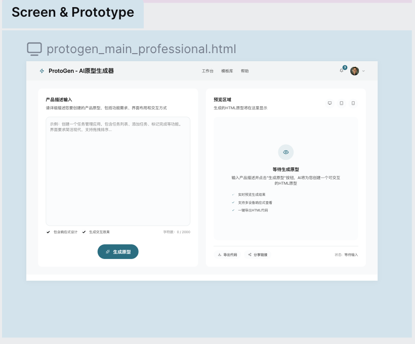 ProtoGen 结合了”即时响应”和”智能理解”的品牌特质,通过自然语言输入+实时预览的一体化设计,让非设计专业人员也能在几分钟内获得专业水准的原型。我们不追求像 Figma 那样的完整设计控制能力,而是专注于”快速验证”场景,让用户用最自然的方式表达想法,并立即看到可视化结果。核心取舍在于:牺牲像素级设计控制,换取极简的学习成本和极快的生成速度。 -