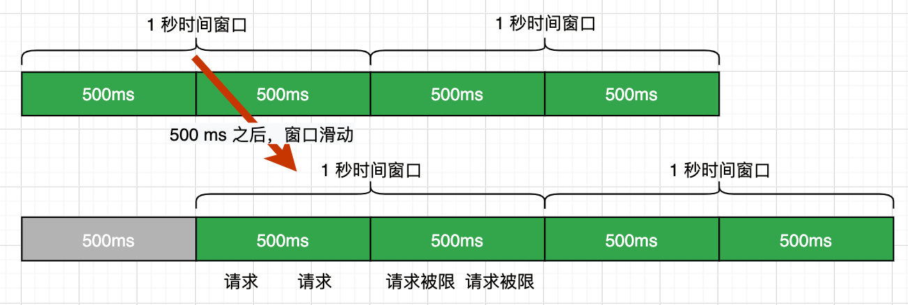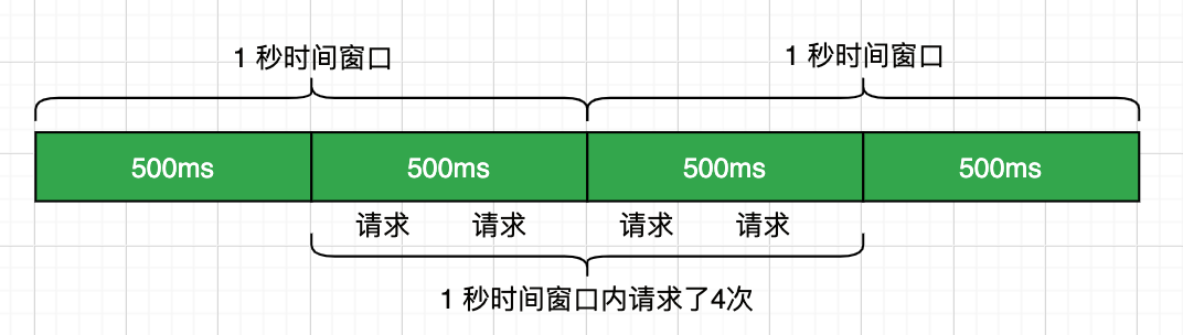 比如我们限制 QPS 为 2,但是当遇到时间窗口的临界突变时,如 1s 中的后 500 ms 和第 2s 的前 500ms 时,虽然是加起来是 1s 时间,却可以被请求 4 次。