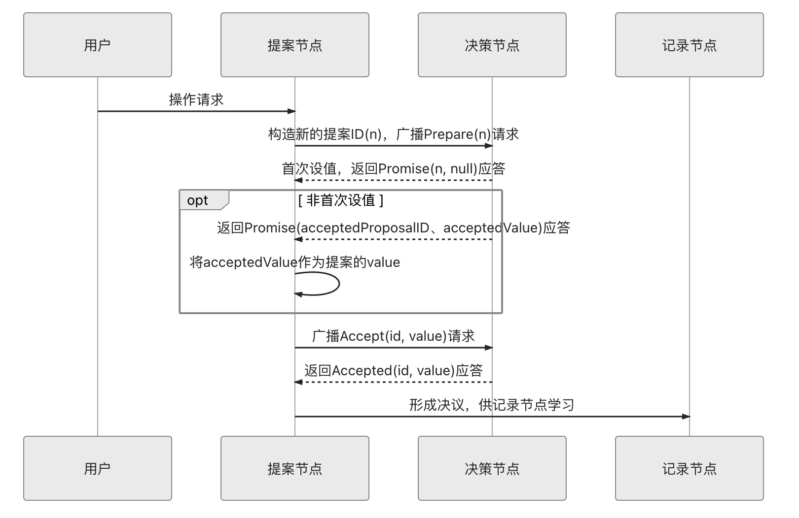 - 决策节点:称为 Acceptor,是应答提案的节点,决定该提案是否可被投票、是否可被接受。提案一旦得到过半数决策节点的接受,即称该提案被批准(Accept),提案被批准即意味着该值不能再被更改,也不会丢失,且最终所有节点都会接受该它。