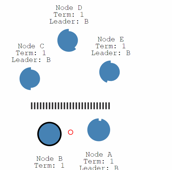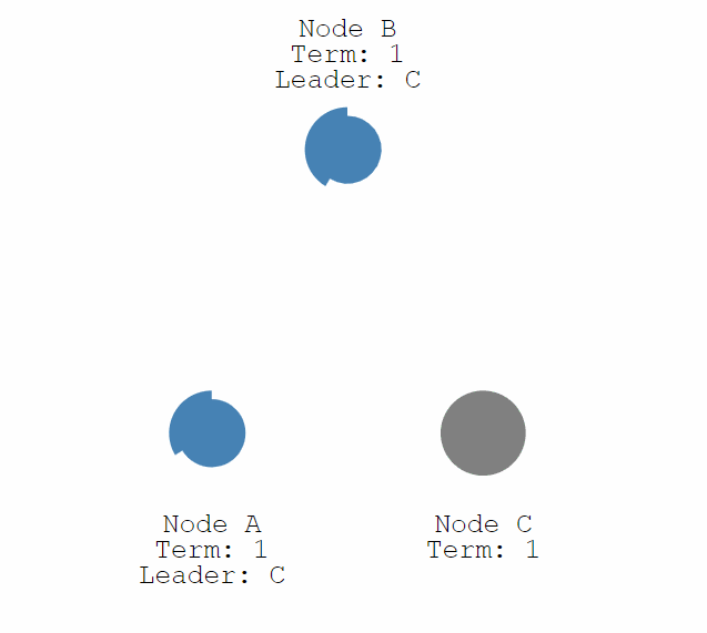 第一种情况是 Leader 下线,此时所有其他结点的计时器不会被重置,直到一个结点成为了 Candidate,和上述一样开始一轮新的选举选出一个新的 Leader。