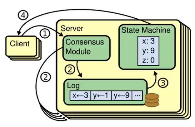 共识算法的实现一般是基于复制状态机(Replicated state machines),何为复制状态机: