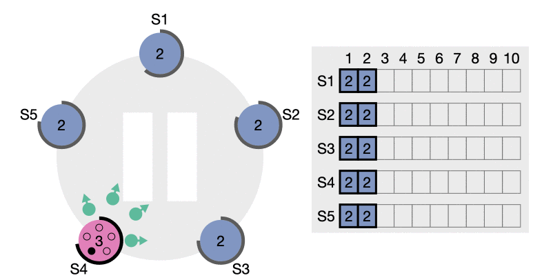 2. 然后,S2 向其他节点发送者条日志,其他节点收到之后,都把这条日志加到本中,但是没有提交(虚线框)
