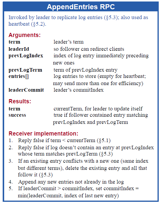 • AppendEntries RPC: Leader日志复制或发送心跳(不含日志项)