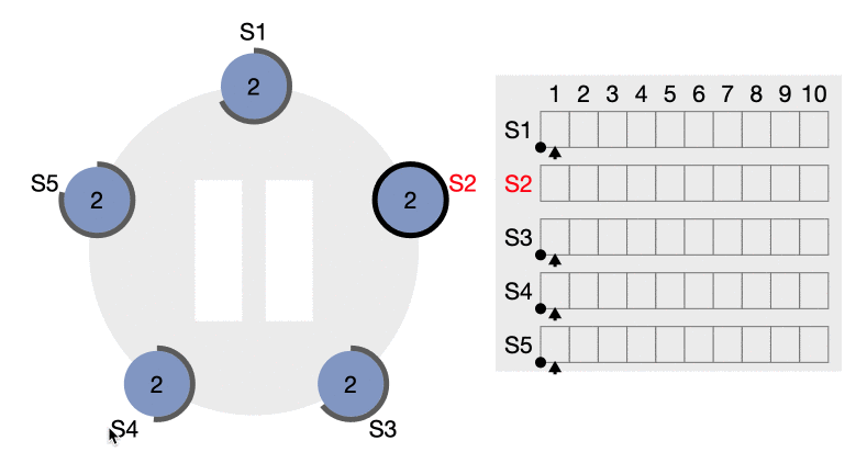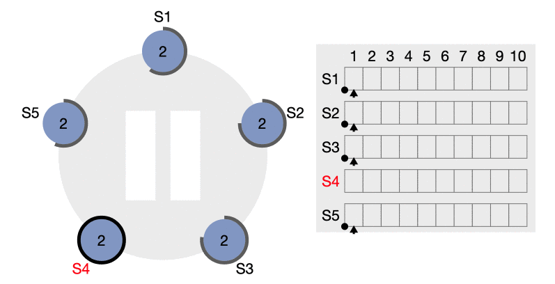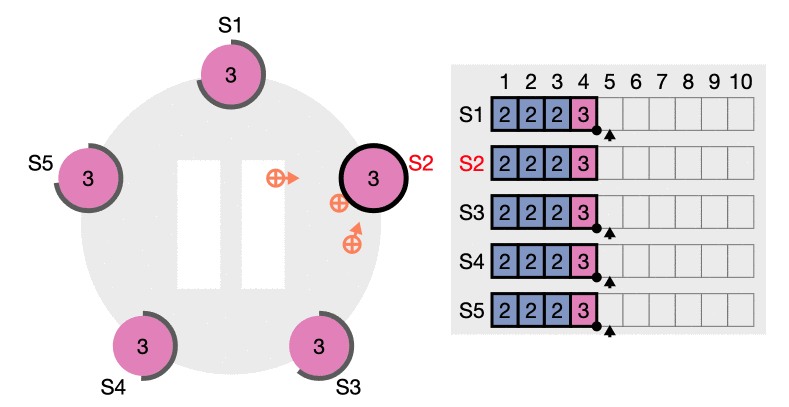 (b) 中 S5 从 S3 和 S4 处获得了投票成为了 Leader 并收到了一条来自客户端的消息,之后 S5 下线。
