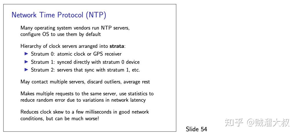 网络上的时间同步由于不可预测的延迟而产生了干扰。 正如在幻灯片 36 上所讨论的,网络延迟和节点的处理速度都可能有很大的不同。为了减少随机变化的影响,NTP 采取了几个时间测量的样本,并应用统计信息来消除异常值。