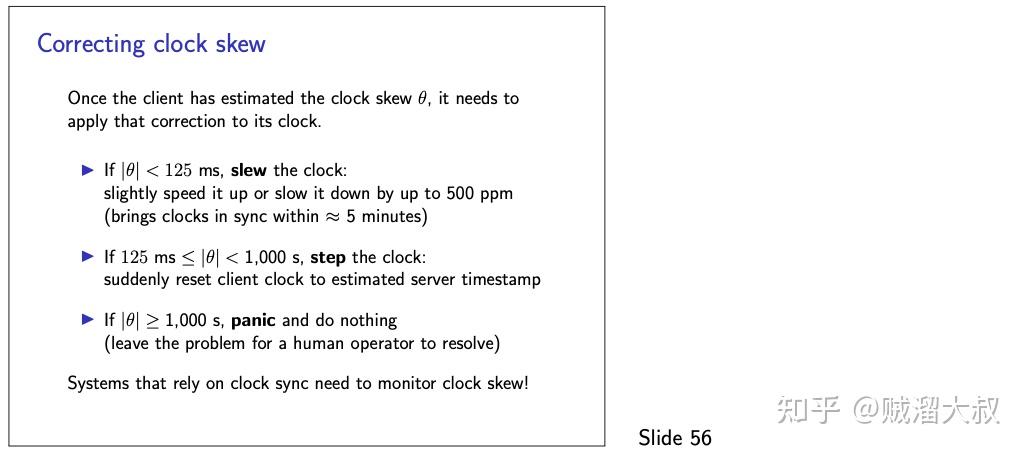 最后,如果偏差非常大(默认情况下,超过 15 分钟),NTP 客户机可能会认为出现了问题,并拒绝调整时钟,将问题留给用户或操作员来纠正。出于这个原因,任何依赖于时钟同步的系统都需要仔细监控时钟偏差:仅仅因为一个节点正在运行 NTP,这并不能保证它的运行时钟将是正确的,因为它可能会陷入恐慌(painc)状态,拒绝调整时钟。