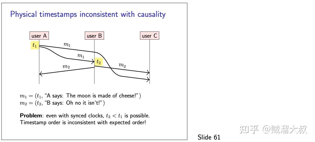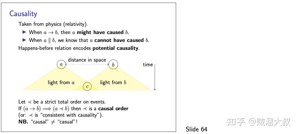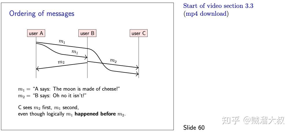 happens-before 关系是分布式系统中因果关系的一种推理方式。因果关系考虑的是信息是否可能从一个事件流向另一个事件,因此一个事件是否可能影响另一个事件。在第 60 张幻灯片的例子中,m2(”Oh no,它不是!”)是对 m1(“月亮是奶酪做的!”)的回复,因此 m1 影响了 m2。一个事件是否真的“导致”了另一个事件,这是一个我们现在不需要回答的哲学问题;对于我们的目的来说,重要的是 m2 的发送方在发送 m2 时已经收到了 m1。