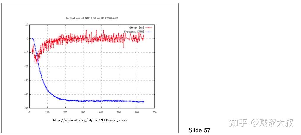 幻灯片 57 显示了一个旋转的例子,在这个例子,客户端的时钟频率收敛到与服务器相同的速率,使两者保持在几毫秒内的同步。当然,在特定系统中实现的精确度取决于客户端和服务器之间网络的时间属性。