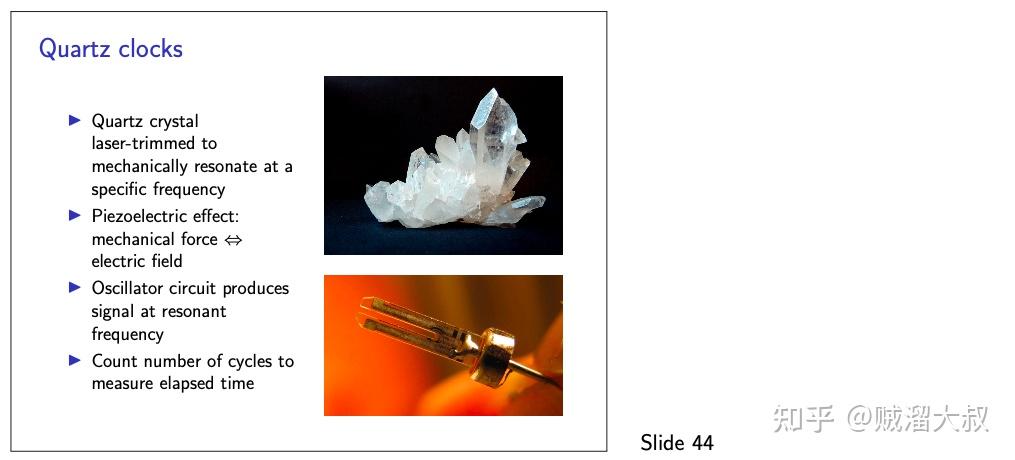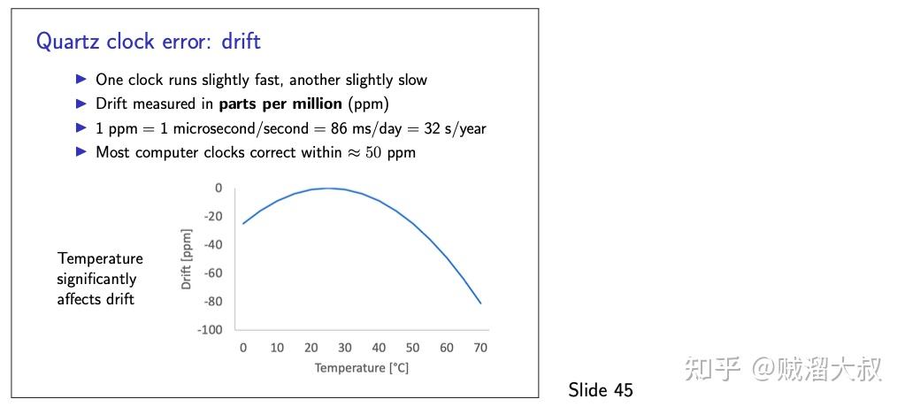 石英时钟很便宜,但它们并不完全准确。由于制造上的缺陷,有些时钟运行得比其他的稍快一些。此外, 振荡频率随温度而变化。典型的石英时钟在室温下被调得相当稳定,但明显较高或较低的温度会使时钟变慢。时钟运行得快或慢的速度被称为 漂移(drift)。
