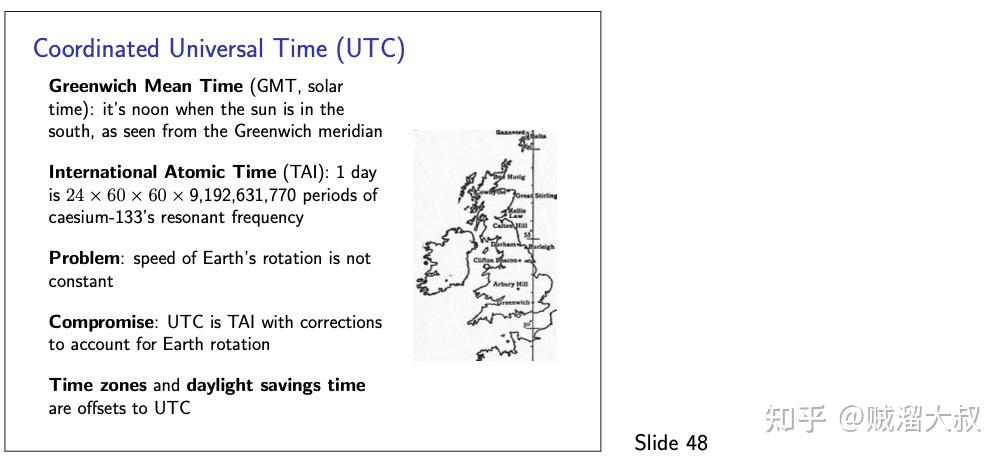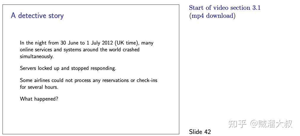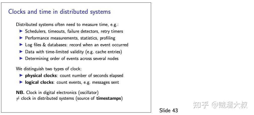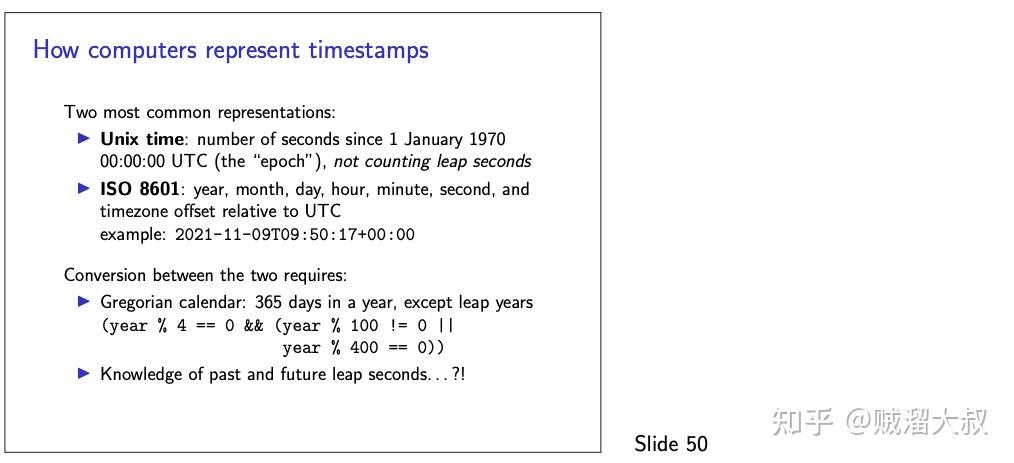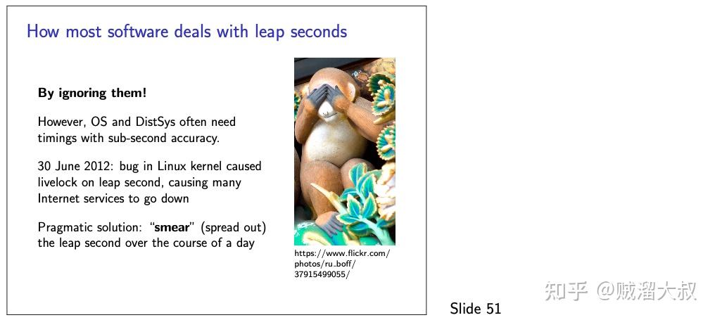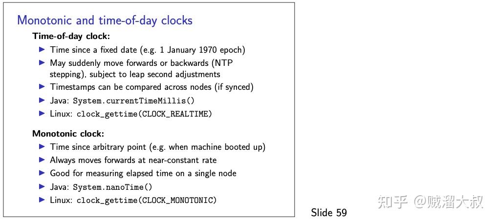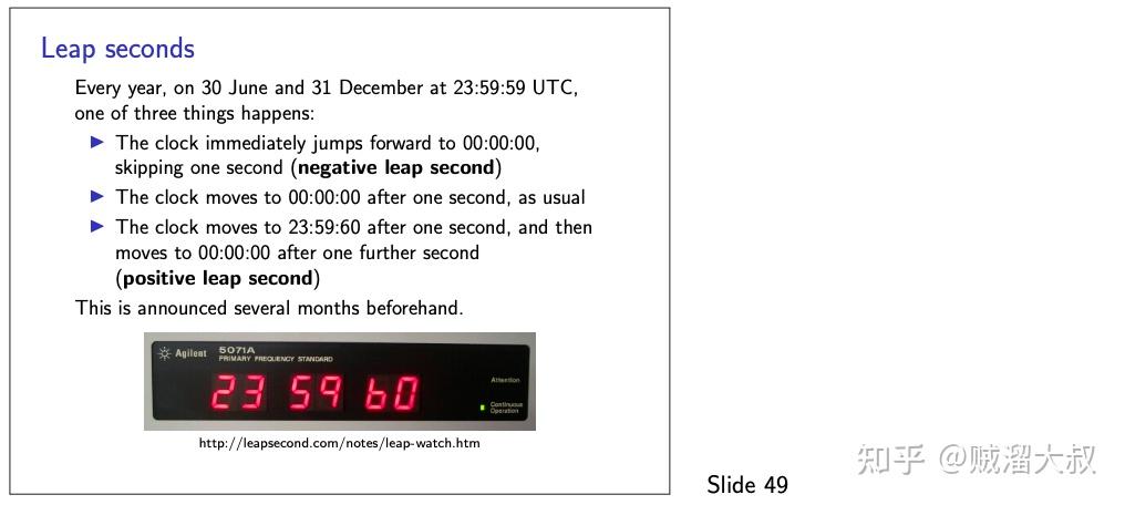 然而,操作系统和分布式系统通常确实依赖于高精度的时间戳来精确地测量时间,其中一秒的偏差是非常明显的。在这种设置下,忽略闰秒可能是很危险的。例如,假设您有一个 Java 程序,它在一个正闰秒内两次调用 System.currentTimeMillis () ,间隔 500ms (即当时钟显示为 23:59:60)。这两个时间戳之间的相差是什么?它不可能是 500,因为当前的时间 currentTimeMillis() 时钟不考虑闰秒。时钟停止了吗,所以两个时间戳之间的差是零?或者差异甚至是负的,所以时钟倒退了一小会儿?本文档不提及这个问题。(最好的解决方案可能是使用单调时钟 monotonic clock ,我们将在幻灯片 58 中介绍)