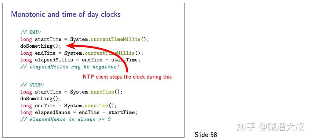 事实上,时钟可能是由于 NTP 步进(stepped),例如突然向前或向后移动,对任何需要衡量运行时间的软件都有重要的影响。幻灯片 58 显示了一个 Java 的示例,我们想要测量 doSomething() 的函数的运行时间。Java 有两个核心函数,用于从操作系统的本地时钟获取当前时戳:currentTimeMillis() 和 nanoTime()。除了不同的精度(毫秒与纳秒)外,两者之间的关键差异是它们在面对 NTP 或其他来源的时钟调整时的表现。