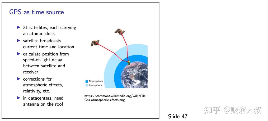 另一种获取时间的高精度方法是依赖于 GPS 卫星定位系统,或类似的系统,如伽利略(Galileo)或格洛纳斯(GLONASS)。这些系统的工作原理是有几颗卫星绕地球运行,并以非常高的分辨率广播当前的时间。接收器测量每颗卫星的信号到达它们所需的时间,并使用它来计算它们与每颗卫星的距离,从而计算它们的位置。通过将 GPS 接收器与计算机连接,只要接收器能够从卫星上获得清晰的信号,就可以获得精确到微秒以内的时钟。在一个数据中心中,通常会有太多的电磁干扰而无法获得一个良好的信号,所以一个 GPS 接收器需要在数据中心大楼的屋顶上安装一个天线。