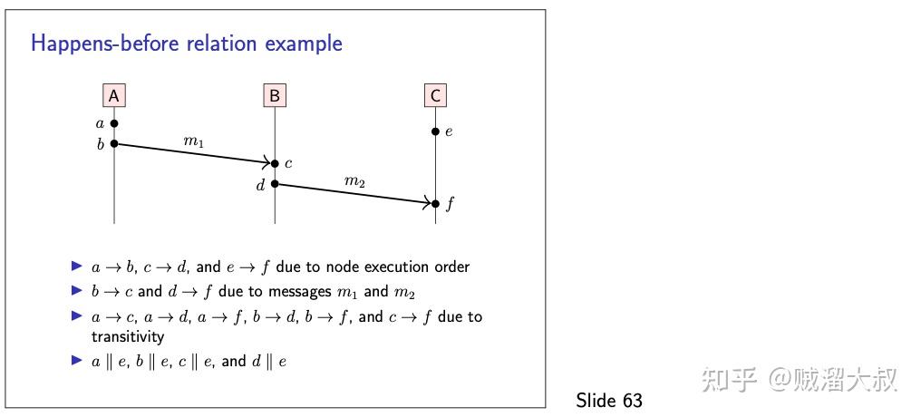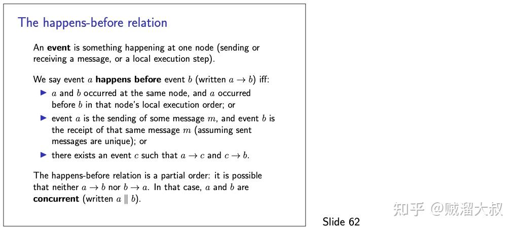在这种情况下,为了形式化我们所说的“正确的”顺序,我们使用幻灯片 62 中定义的 happens-before 关系。该定义假设每个节点只有一个执行线程,因此对于一个节点的任意两个执行步骤,可以清楚地知道哪一个先发生。更正式地说,我们假设在同一节点上发生的事件有严格的总顺序。一个多线程进程可以通过使用单独的节点来表示每个线程来建模。