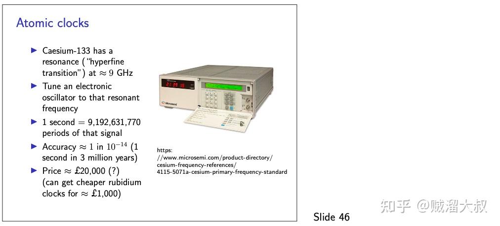 当需要更高的精度时,就会使用原子钟。这些时钟是基于某些原子的量子力学特性,如铯或铷。事实上,在国际单位制(International System of Units, SI)中,一秒的时间单位被认为恰好是铯-133 原子的特定共振频率的 9,192,631,770 个周期。