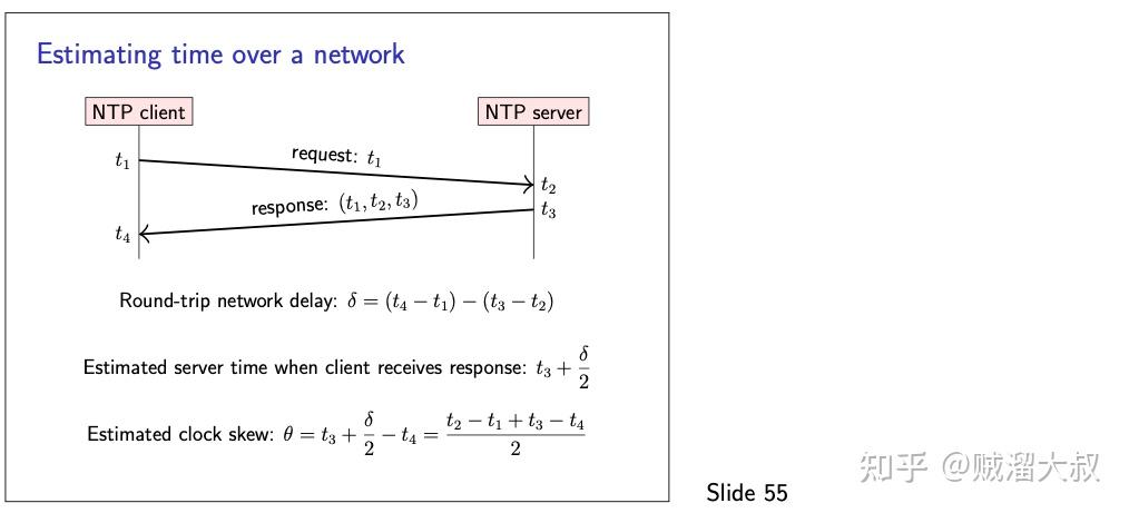 幻灯片 55 显示了 NTP 如何估计客户端和服务器之间的时钟偏差。当客户端发送一个请求消息时,它会根据客户端的时钟包含当前的时间戳 t1。当服务器接收到请求时,在处理之前,服务器根据服务器的时钟记录当前时间戳 t2。当服务器发送响应时,它会回显请求中的值 t1,并在响应中包含服务器的收据时间戳 t2 和服务器的响应时间戳 t3。最后,当客户端接收到响应时,它会根据客户端的时钟记录当前的时间戳 t4。