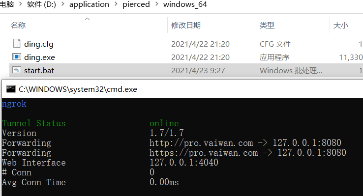 首先使用 git 下载 钉钉内网穿透工具,下载好后找到 windows_64 目录,在这里新建一个 start.bat 文件,内容为