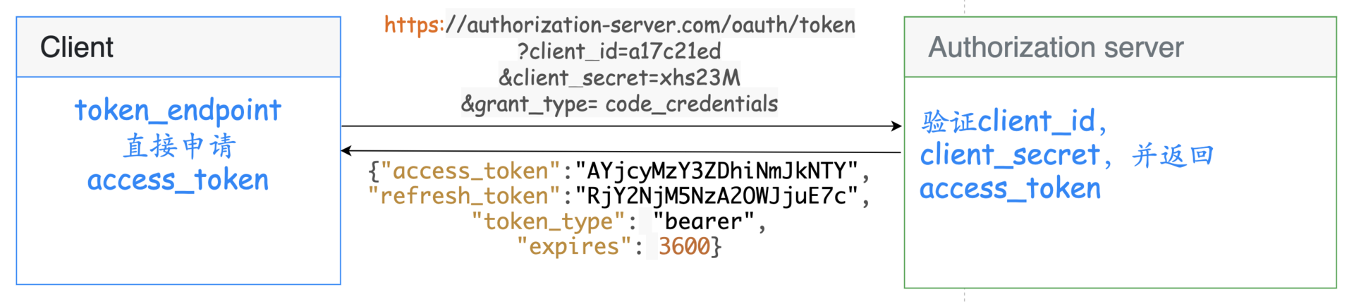 - 针对客户端凭证需要多说的一点就是,不能将其传递到客户端,客户端无法保证凭证的安全,凭证应该始终留在应用的服务器端,当下发code回调请求到应用服务器时,在服务器端携带上凭证再次请求下发令牌。