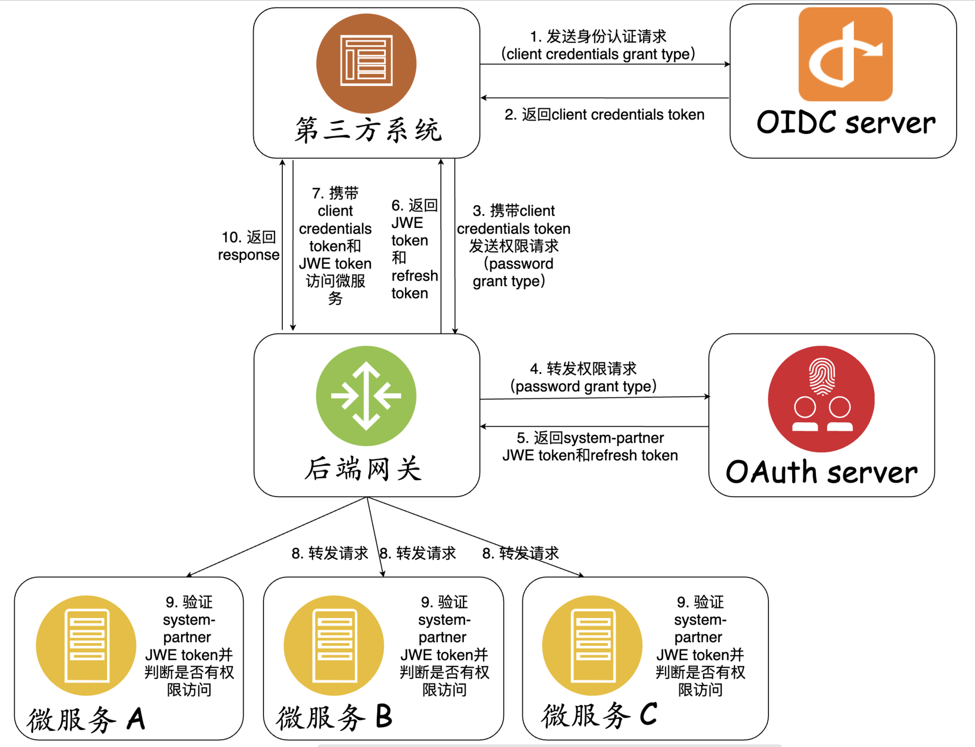 在第三方系统得到了 client credentials token 和 JWE token 后,可以以与之前相同的方式发往我们的微服务,微服务会在解析 token 时识别出其 system partner 的权限,执行相应的业务逻辑。