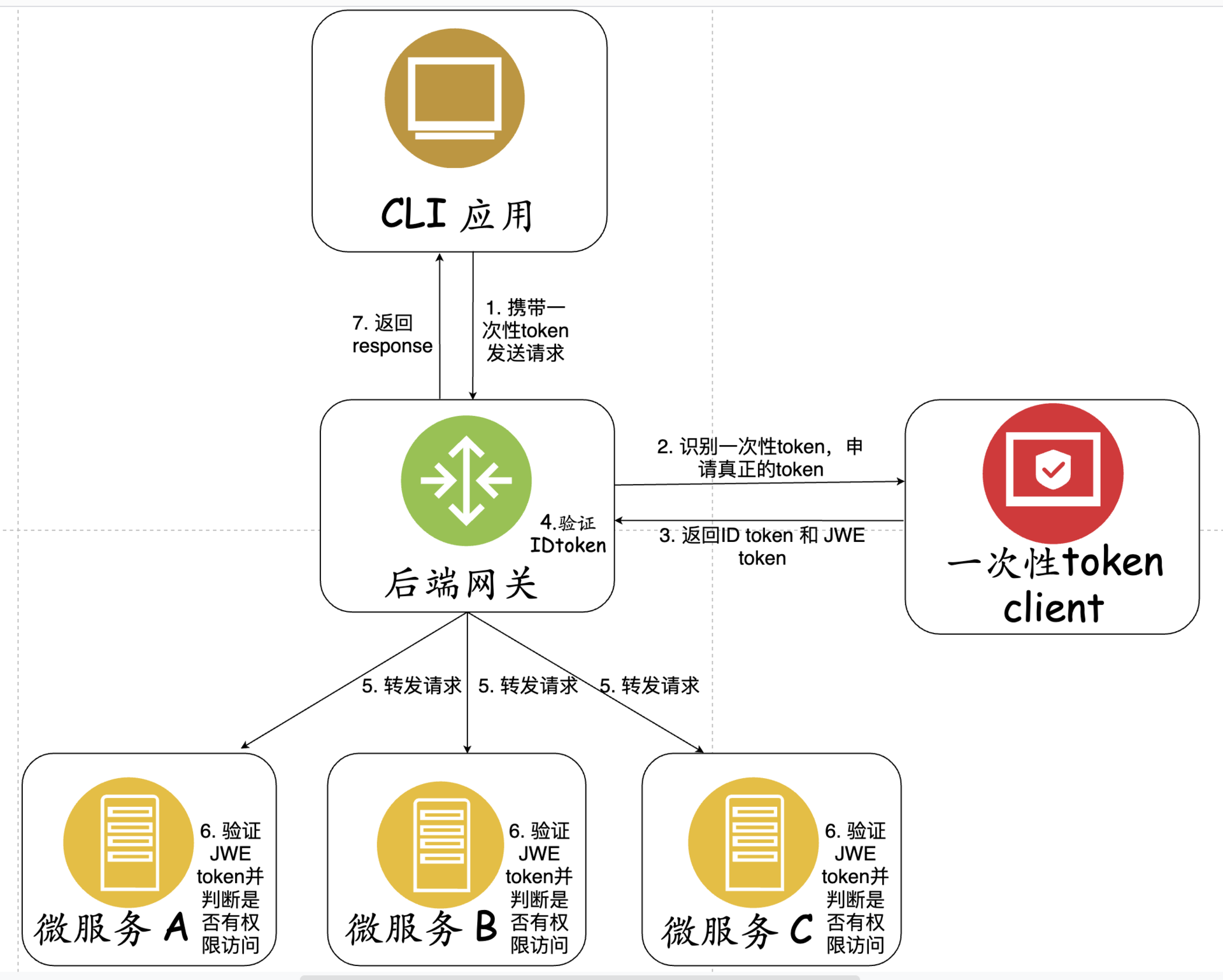 用户会被要求用浏览器申请一个特殊的 url,得到一个有限时长的一次性 token,CLI 应用可以使用这一个 token 来正常的从网关访问后端微服务。