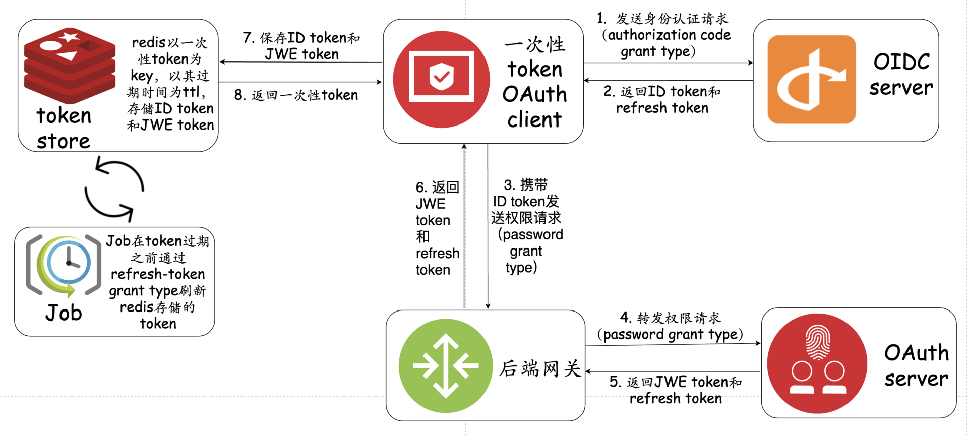 其背后是一个独立的 OAuth client 在做支撑,这个 OAuth client 会以授权码模式先申请身份认证服务(OIDC ),得到 ID token 后再在后端直接申请授权服务(OAuth )获取 JWE token,并将两个 token 保存在 redis 中,并生成一个 unique ID 作为一次性 token 返回。同时用一个 job 来进行 token 过期前的刷新,以确保一次性 token 可以在其较长的有效时间内一直保持其有效性。