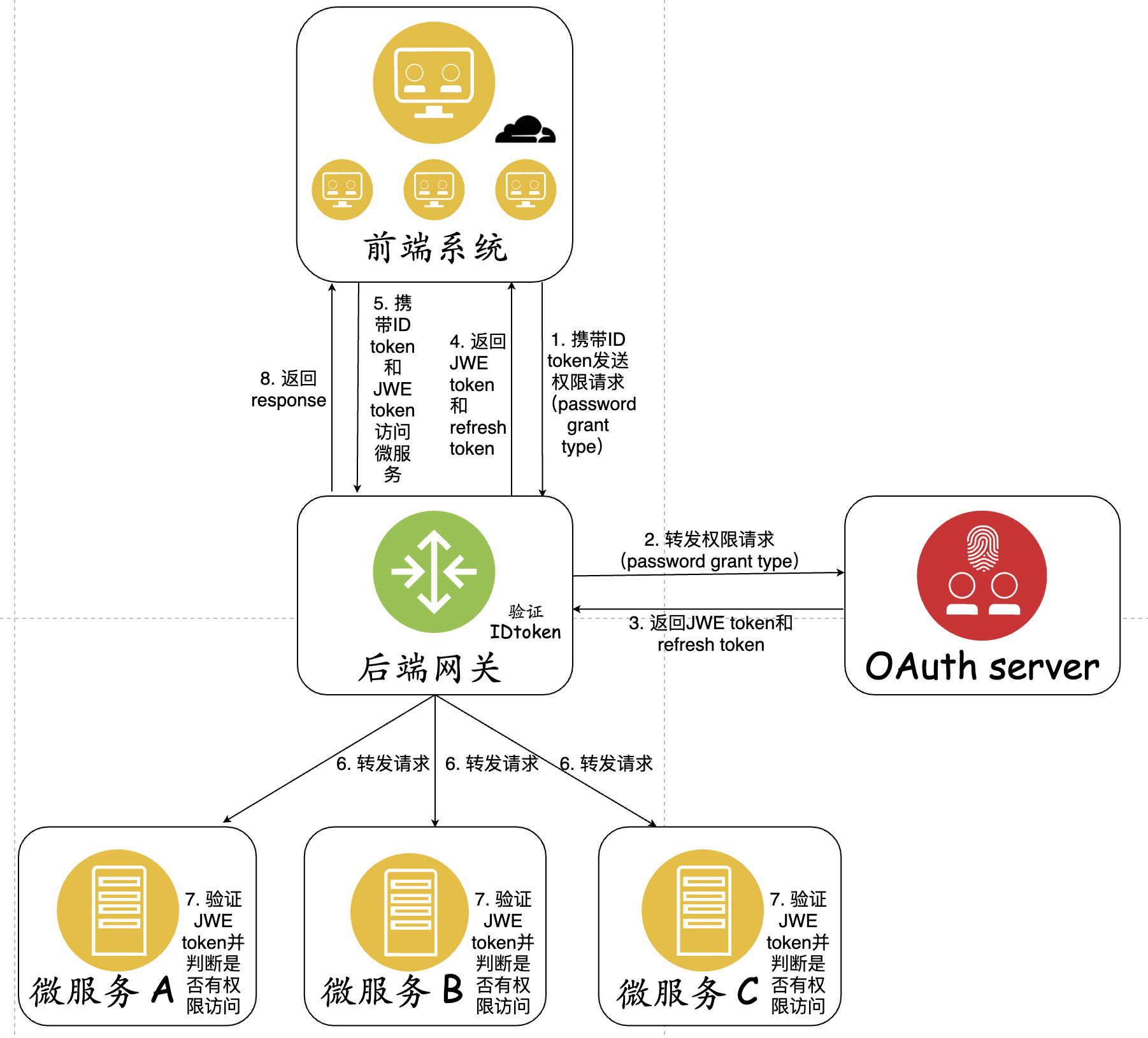 网关进行身份验证后,授权服务不需要让用户重新输入身份信息,因此应该由一个简单的 api 请求来完成。借助于 OAuth2.0 协议,我们可以使用密码流程(password grant type)来为用户进行授权。用户密码即为可自验证的 ID token,而非用户的真正密码,我们借助密码流程的优势,构建一个支持解析用户 ID token,并符合 OAuth2.0 协议标准的授权服务。