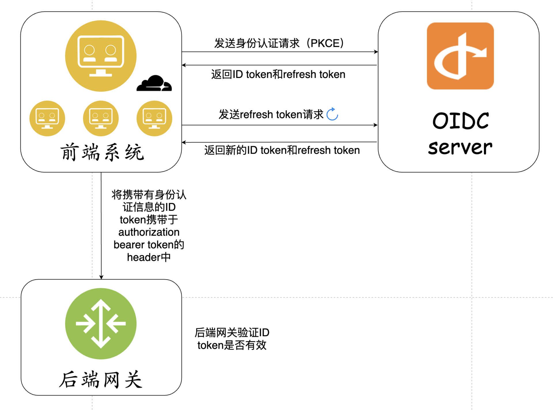 我们可以使用前文所介绍的 PKCE 模式,安全的为前端应用授权。而后端只需要在网关层面拦截所有的请求验证身份即可,此时,前端应用就是身份验证服务(OIDC )的 client,后端网关将成为身份验证服务(OIDC )的 resource 。