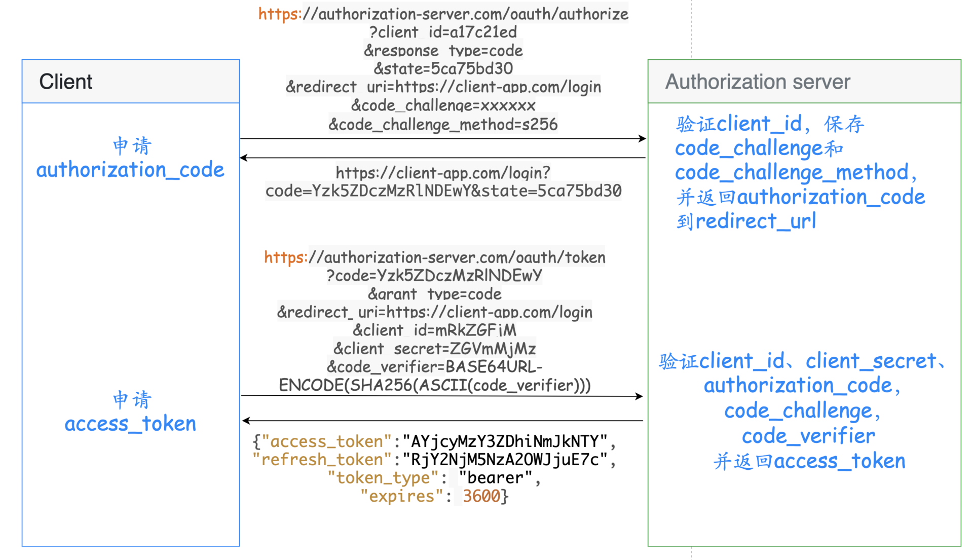 在隐藏模式介绍中我们可以发现,该模式是有明显的缺点的,即其 silent refresh 的刷新方式,authorization 所保存的用户登录 session 不可能永远不失效,一旦失效,我们还是需要用户重新登录才能确保 client 使用正确有效的 token。为了解决这个缺点,PKCE 模式应运而生。 PKCE 模式通过改造传统的授权码模式,在请求 authorization endpoint 的同时,加入 code_challenge 和 code_challenge_method 参数,得到授权码后,在请求 token endpoint 时加入 code_verifier 参数,authorization 会验证 code_challenge 和 code_verifier 是否匹配,以此来防止两步请求中可能产生的中间人攻击。
