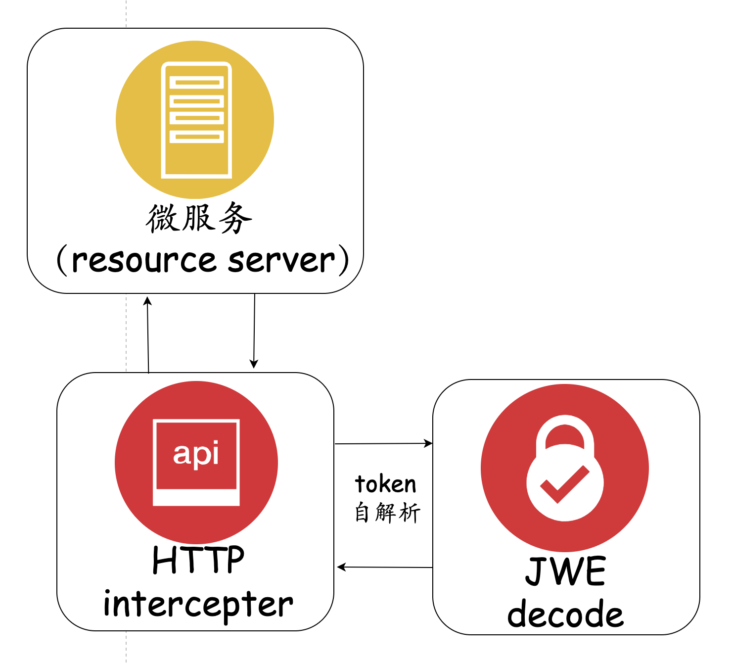 秉承着避免与 authorization 交互的原则,JWE token 使用 client secret 作为密钥进行加密,因此 resource 可以通过 client secret 对获得的 JWE token 进行自解析,并由全局的 http intercepter 来决定用户是否有权限访问服务或着服务的某个 endpoint,以及 endpoint 背后与权限有关的业务逻辑。微服务可以自行用各种开源的 JWE 工具进行解析,也符合微服务跨语言的基本特性。