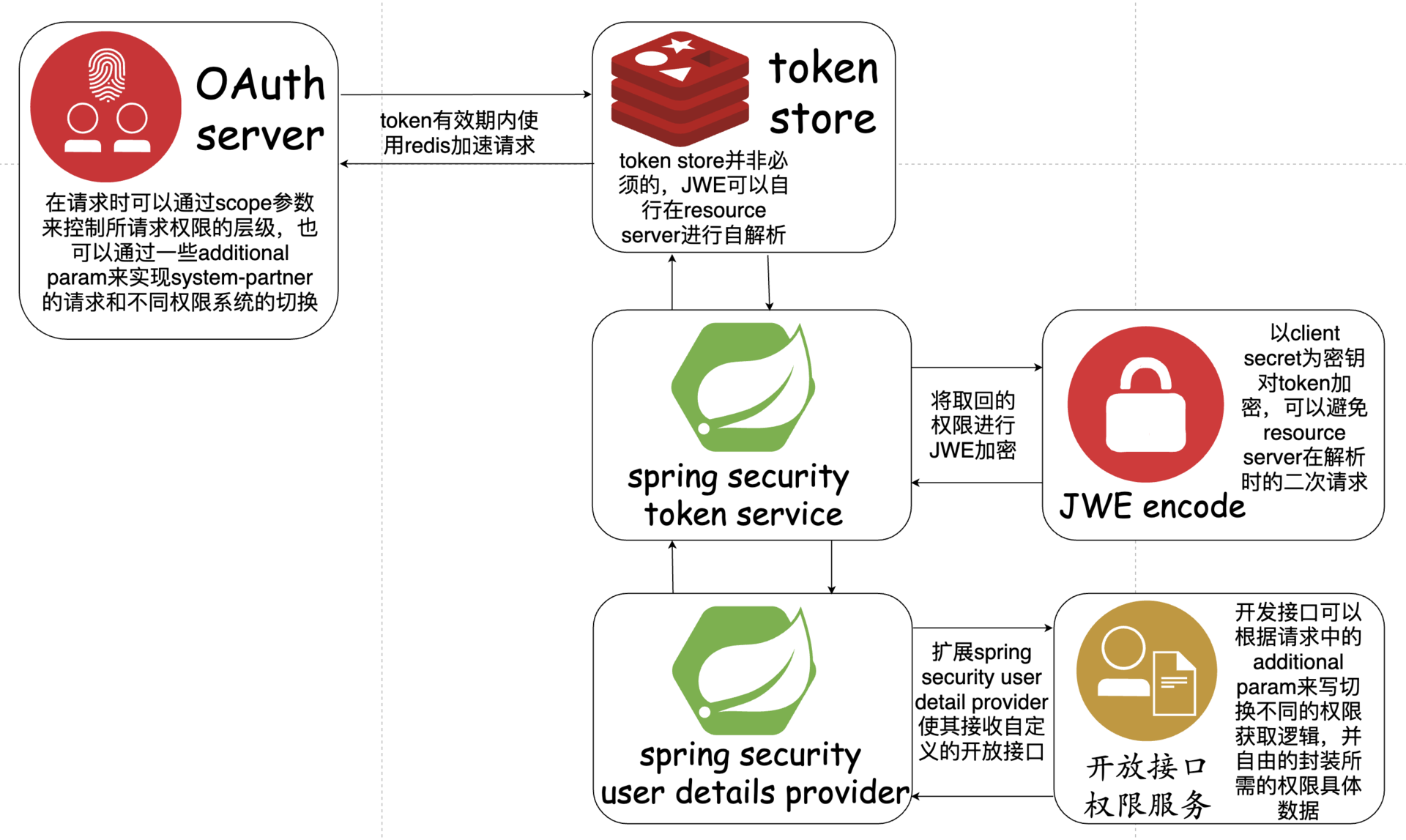 在实现中,我们使用 spring security 作为技术基础,完全遵循 OAuth2.0 协议,将其进行改造,让 spring security 支持我们的自定义的 token encode 方式,并重新实现了 user details provider 来扩展权限系统。并且得益于 JWE 的使用,我们无需提供具体的 storage 来保存 token,redis 仅仅用于在 token 有效期内避免再次与权限服务交互,加速接口请求速度。