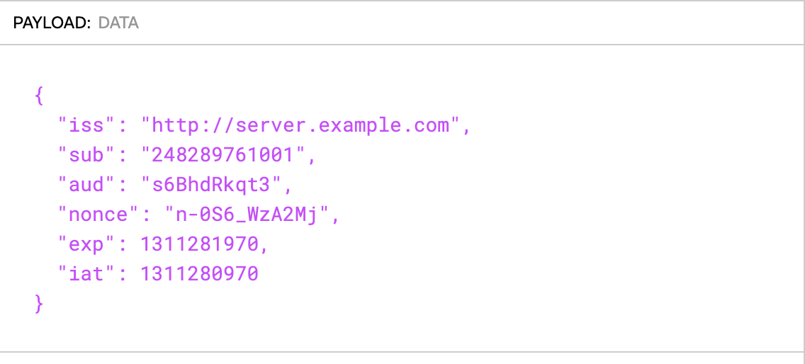 得益于 JWT 的自解析性,client 可以不申请 introspection endpoint 就可以解析出 ID token 所包含的身份信息。JWT 内部是一些定义的属性名称,它们为应用程序提供信息。它们用简写名称表示,以保持 JWT 的整体大小。这包括用户的唯一标识符(sub 即“subject”的缩写),发出 token 的服务器的标识符(iss 即“issuer”的缩写),请求此 token 的 client 的标识符(aud 即“audience”的缩写),以及少数属性,例如 token 的生命周期,以及用户在多长时间之前获得主要身份验证提示。