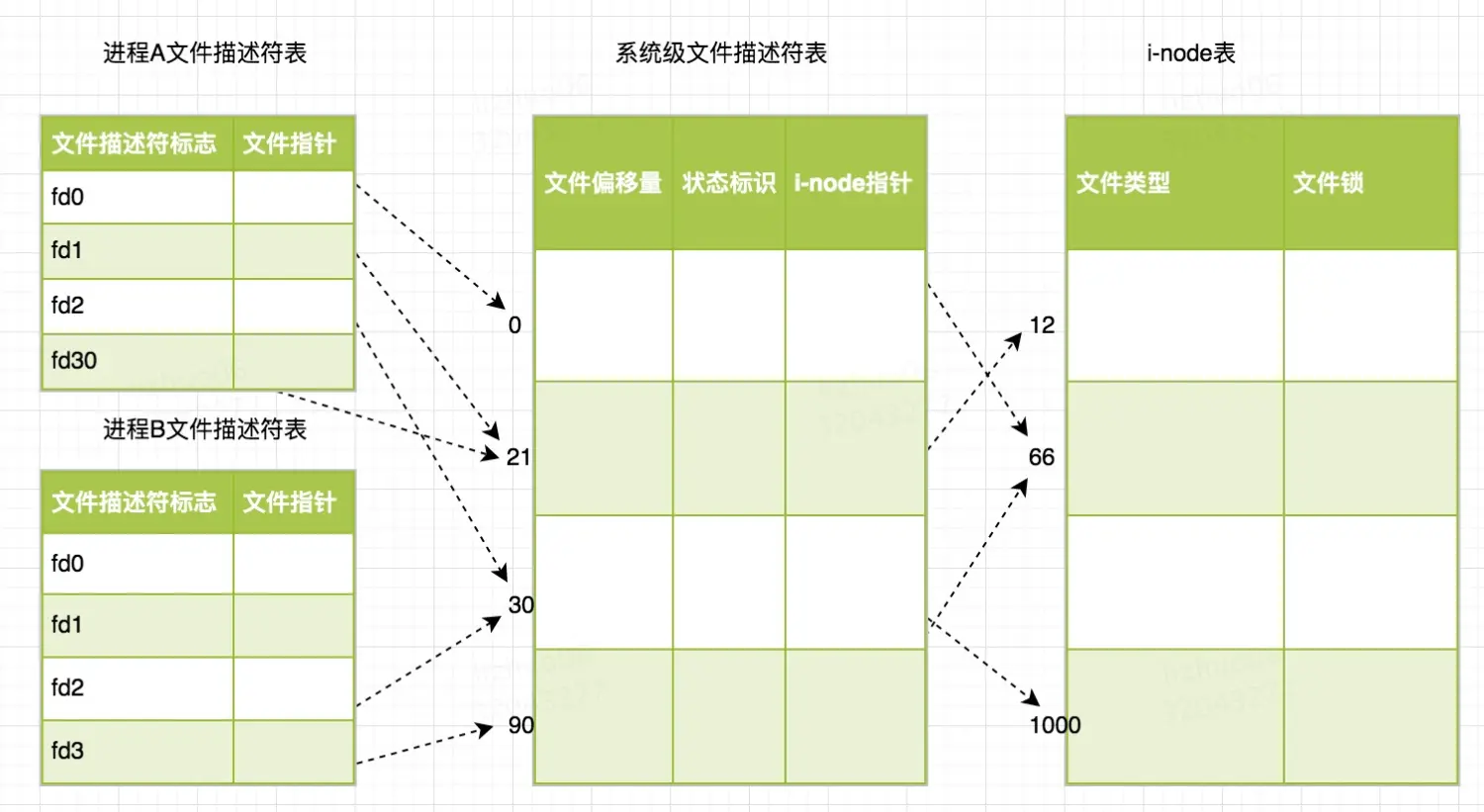 系统为每一个进程维护了一个文件描述符表,所以在不同的进程中会看到相同的 fd。那么要理解具体的内部结构,需要理解下面这三个数据结构