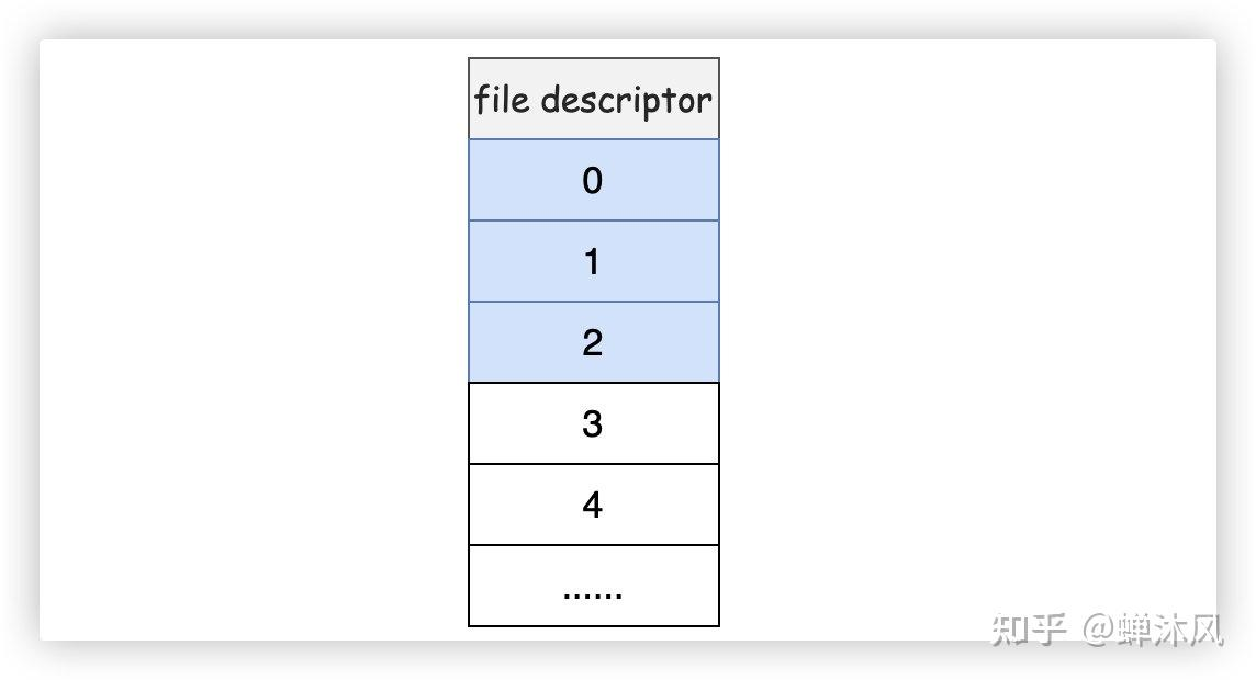 需要注意的是,每个进程的 fd 0,1,2 已经被占用(下文会有解释),之后分配的每个进程的 fd 从 3 开始。
