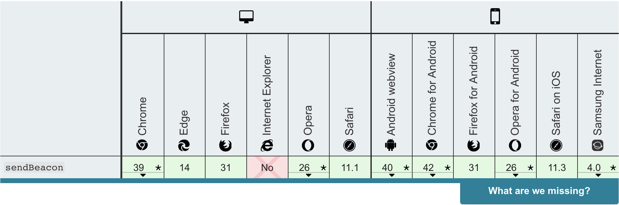 可以看到大部分浏览器已经支持 这个特性,因此可以作为主要的提交方式,由于IE系列并不支持这个特性,在无法获取到navigator.sendBeacon 的时候退回到同步ajax请求。