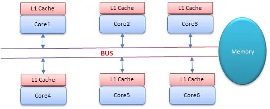 其意思是所有的 CPU 会共享一条系统总线(BUS),靠此总线连接主存。每个核都有自己的一级缓存,各核相对于 BUS 对称分布,因此这种结构称为“对称多处理器”。
