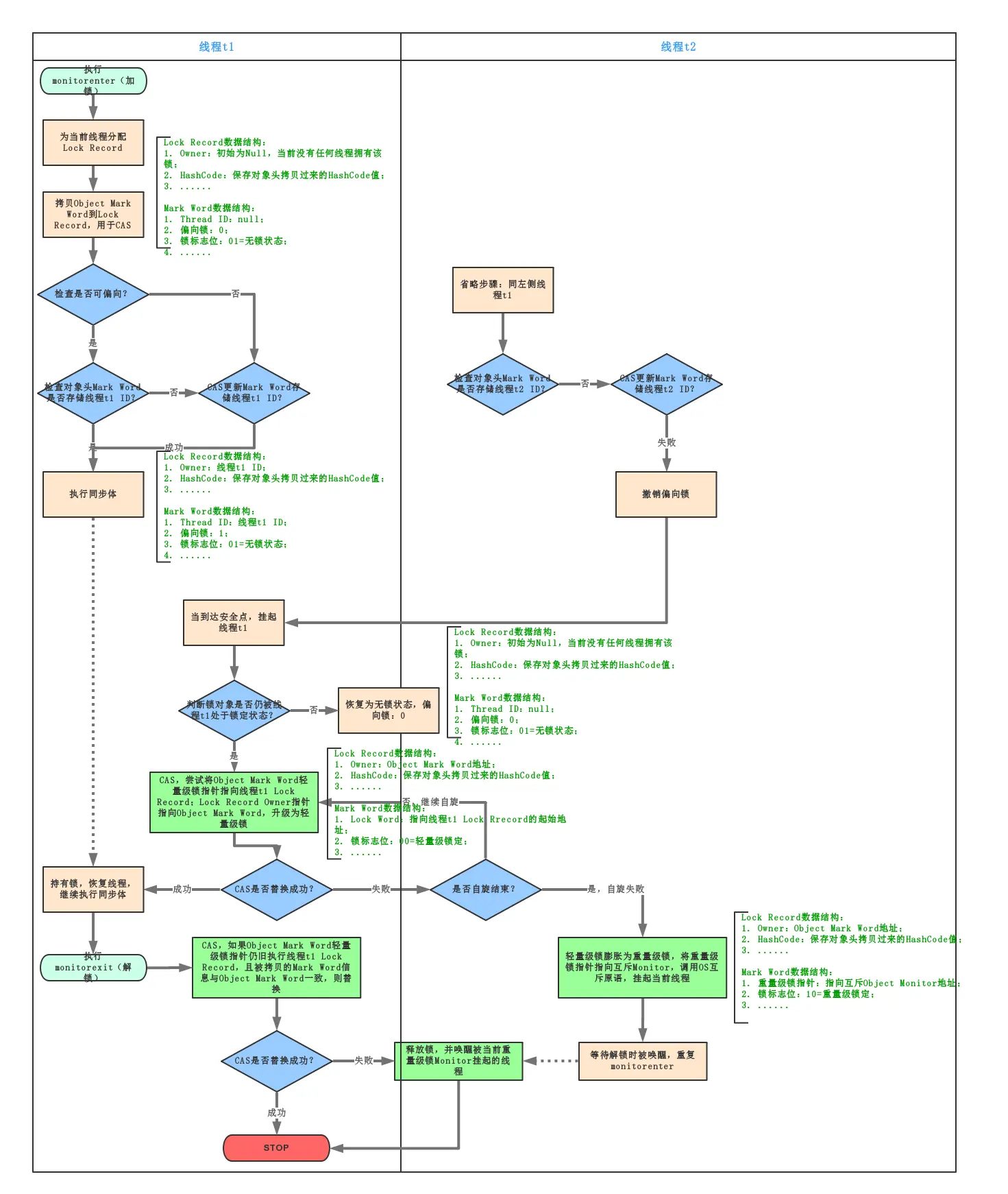 - 通过 CAS 竞争锁失败,证明当前存在多线程竞争情况,当到达全局安全点,获得偏向锁的线程被挂起,偏向锁升级为轻量级锁,然后被阻塞在安全点的线程继续往下执行同步代码块;