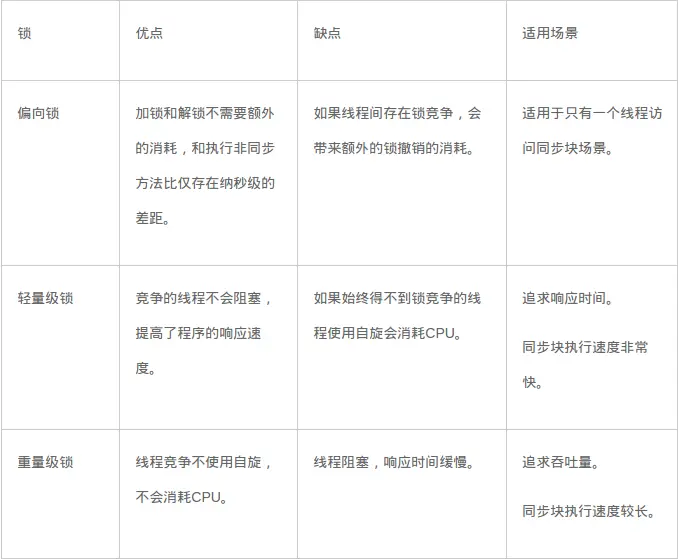 各种锁并不是相互代替的,而是在不同场景下的不同选择,绝对不是说重量级锁就是不合适的。每种锁是只能升级,不能降级,即由偏向锁→轻量级锁→重量级锁,而这个过程就是开销逐渐加大的过程。