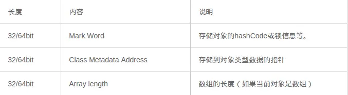- 对象头:Java 对象头一般占有 2 个机器码(在 32 位虚拟机中,1 个机器码等于 4 字节,也就是 32bit,在 64 位虚拟机中,1 个机器码是 8 个字节,也就是 64bit),但是如果对象是数组类型,则需要 3 个机器码,因为 JVM 虚拟机可以通过 Java 对象的元数据信息确定 Java 对象的大小,但是无法从数组的元数据来确认数组的大小,所以用一块来记录数组长度。