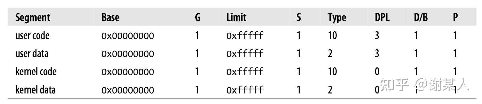 ​ 2.6版的Linux只有在 80x86 结构下才进行分段,下图为Linux的分段结构