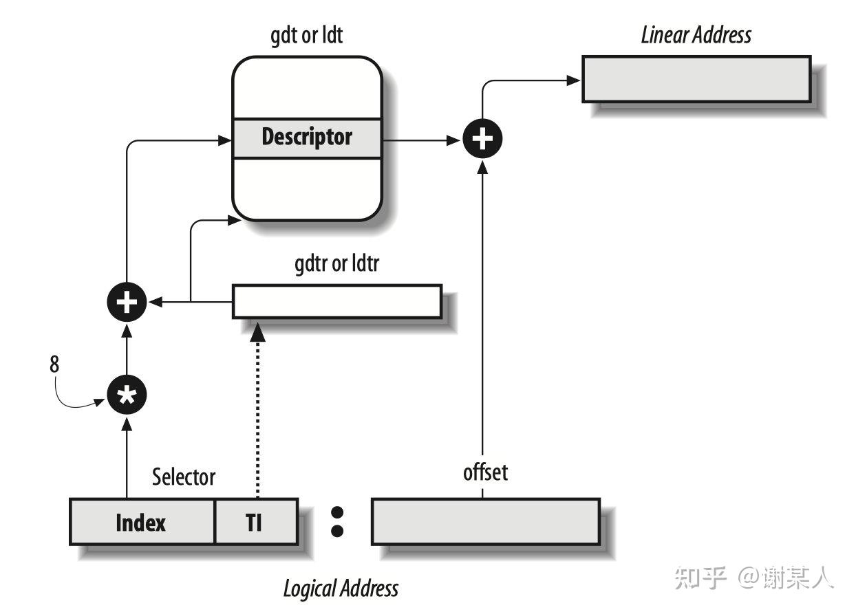 ​ 图六已经较为清楚的展示了分段单元把逻辑地址转为虚拟地址的过程,段选择符在段寄存器中,offset存储在ip寄存器中