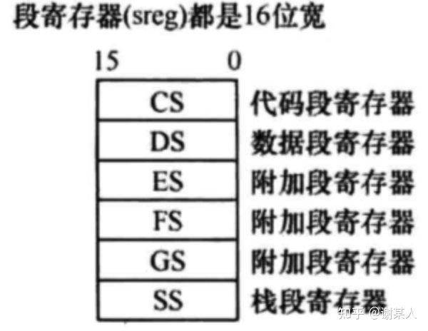 段寄存器存放段选择符,段寄存器共有 cs,ss,ds,es,fs和gs六个,其作用如图三所示。