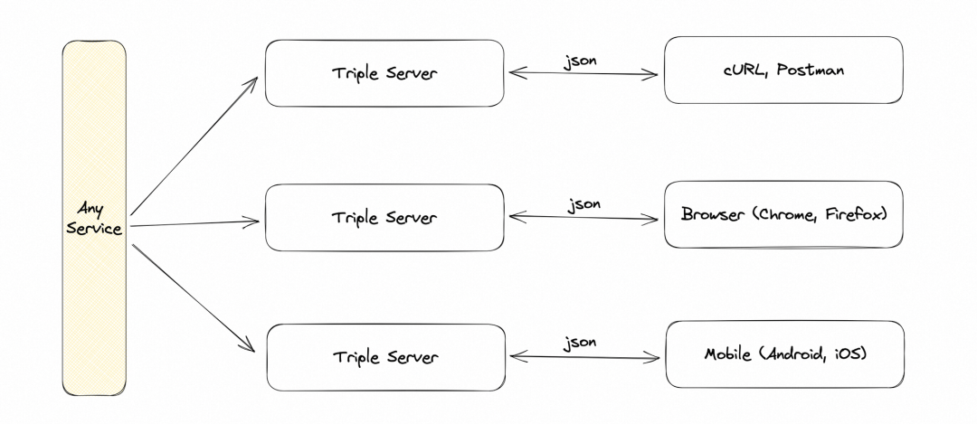 Triple 协议支持基于 json 这种通用格式,将任意服务暴露到外部,任何支持标准 HTTP 协议的客户端(如 cURL、浏览器、终端)都可以直接发起调用,无需任何协议转换。