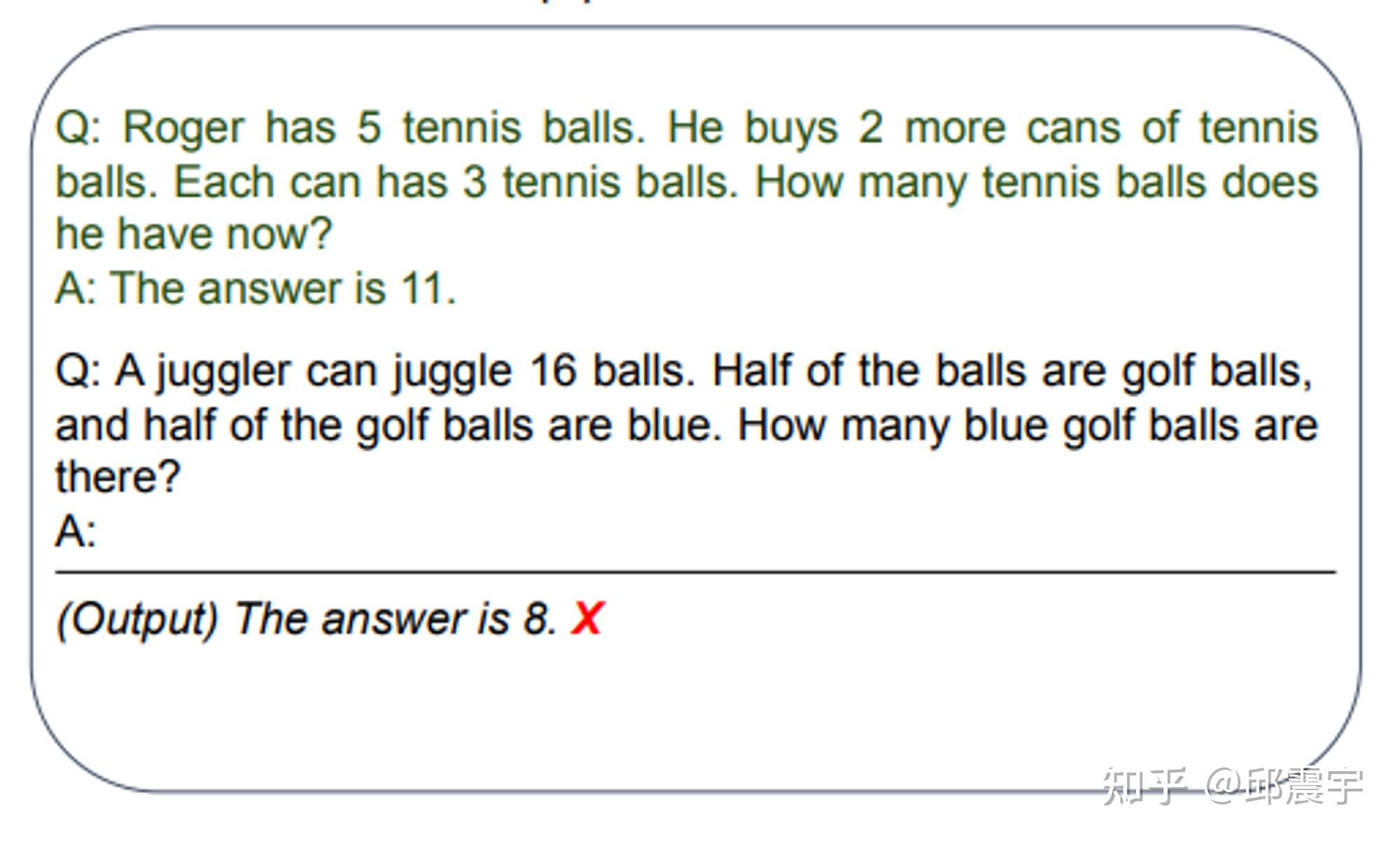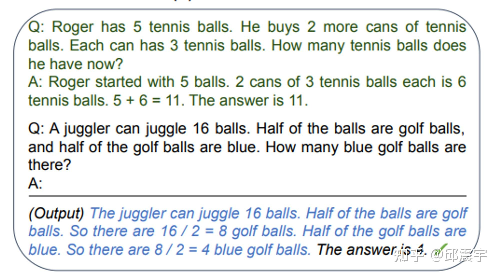 然而,当我们将上述问题范例中的答案再细化一些,对推到出答案的 每一个步骤都写出来 ,再将测试样例一起输入到模型中,此时模型居然能够正确回答了,而且也能够参照范例中的样例进行一定的推理,如图所示: