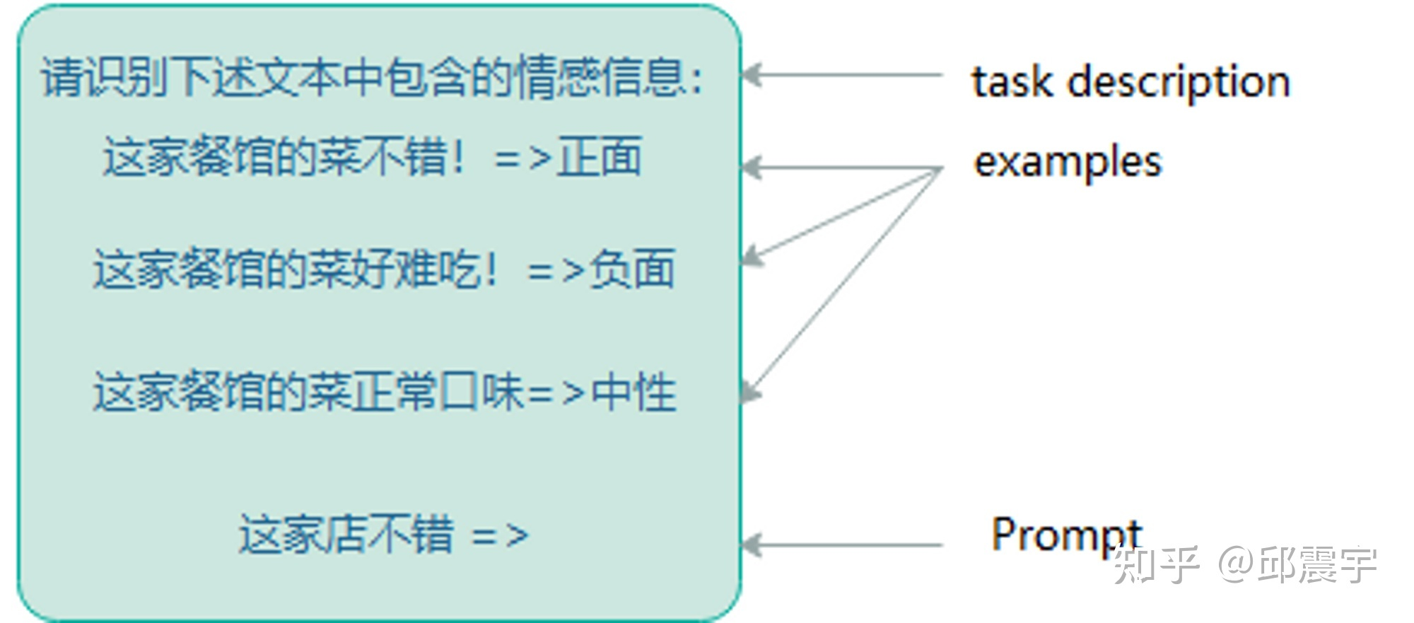 参考下图的例子来理解:其中,task description 和 examples 用来帮助模型学习新任务,最后的 Prompt 用来测试模型是否学会了。