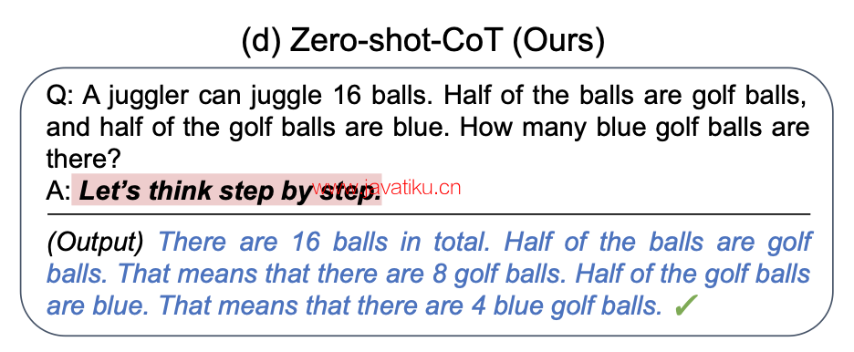 - 显示植入提示语:Let’s think step by step (让我们一步步思考)