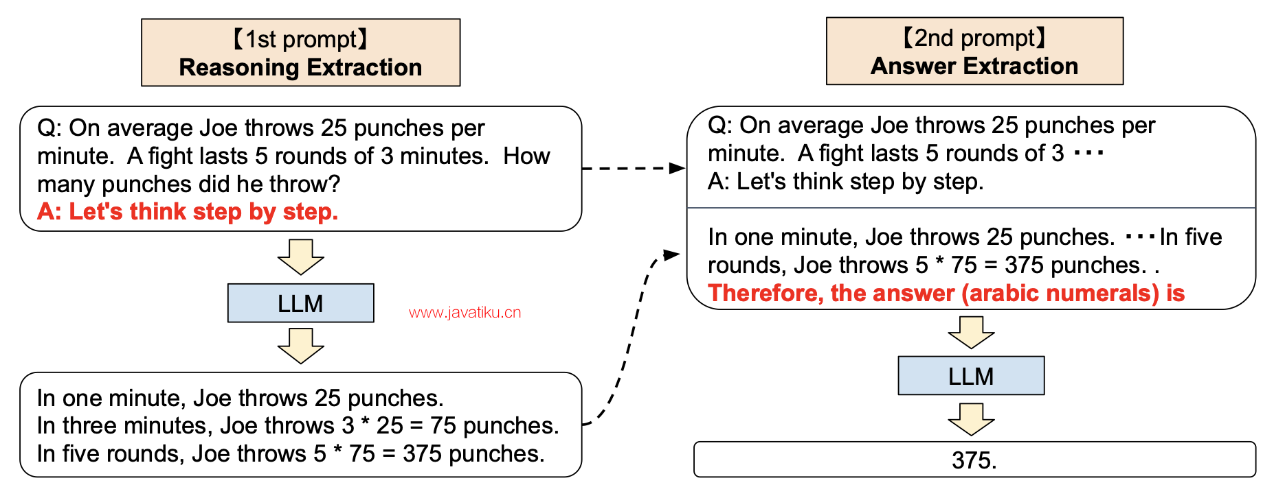 从技术上讲,完整的零样本思维链过程涉及两个单独的提示/补全结果。下图中,左侧顶部气泡生成一个思维链,而右侧顶部气泡接收来自第一个提示(包括第一个提示本身)的输出,并从思维链中提取答案。这个第二个提示是一个自我增强的提示。