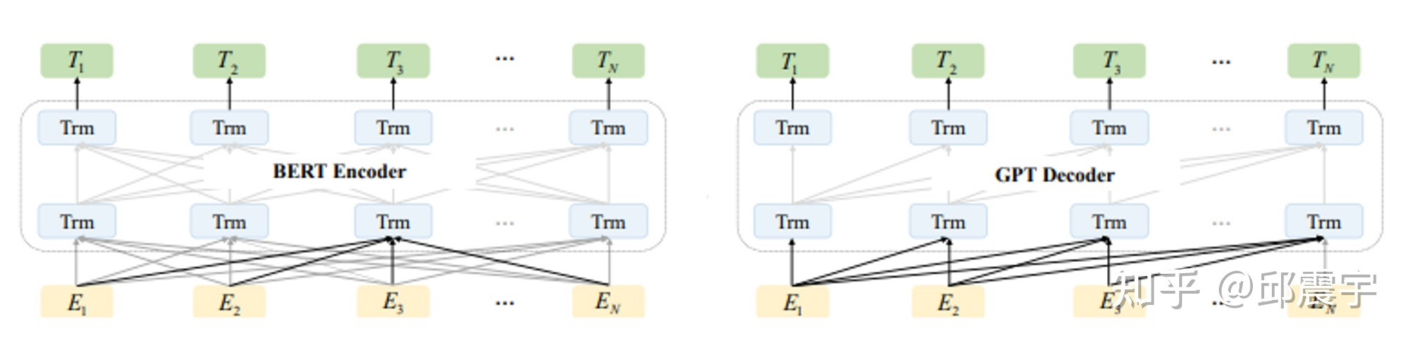 图中左半部分是 BERT 的示意图,右半部是 GPT 的示意图,Trm 为一个 Transformer 模型组件,E 为输入的 token 序列,T 为模型生成的 token 序列。