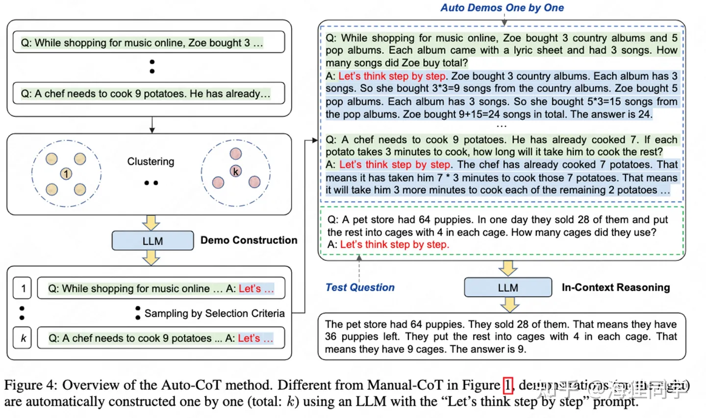 为了缓解手动设计的困难,Auto-CoT 方法自动构建具有 questions 和 reasons chains 的演示。