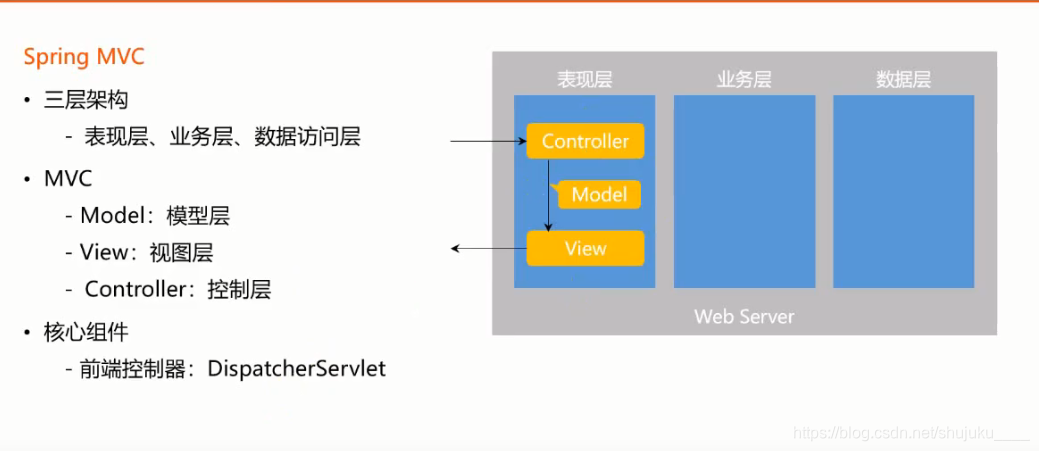 浏览器访问表现层(Controller)⇒表现层访问业务层⇒将数据封装到(Model)⇒再通过(View)渲染