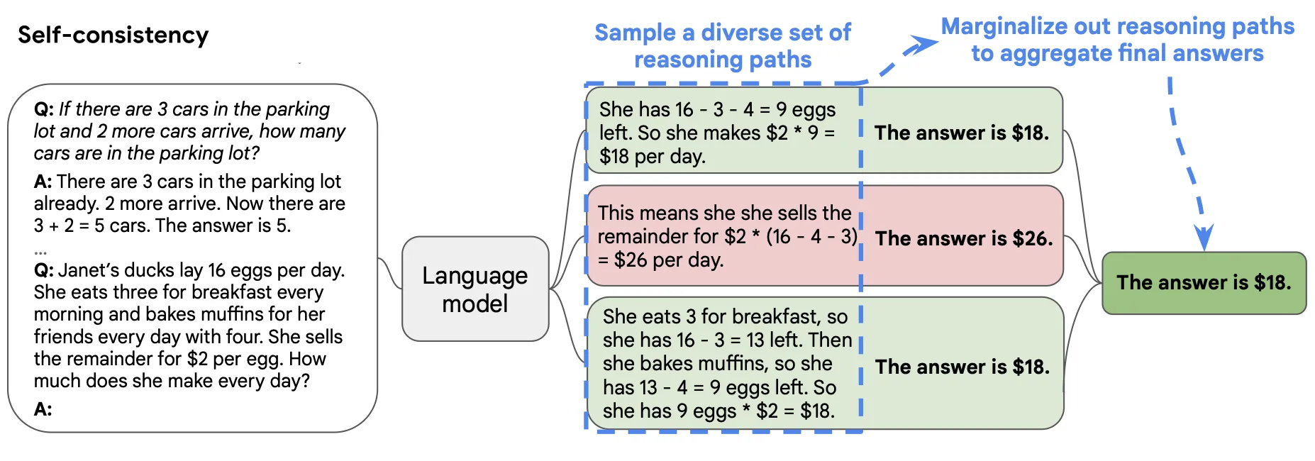 在下面的图中,左侧的提示是使用少样本思路链范例编写的。使用这个提示,独立生成多个思路链,从每个思路链中提取答案,通过“边缘化推理路径”来计算最终答案。实际上,这意味着取多数答案。