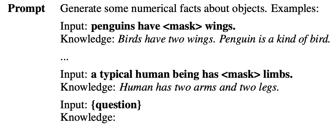 在知识生成步骤中,LLM 被要求生成一组关于问题的事实。如下所示,LLM 以少量方式提示。使用相同的提示生成 M 个不同的补全(类似于自洽方法)。